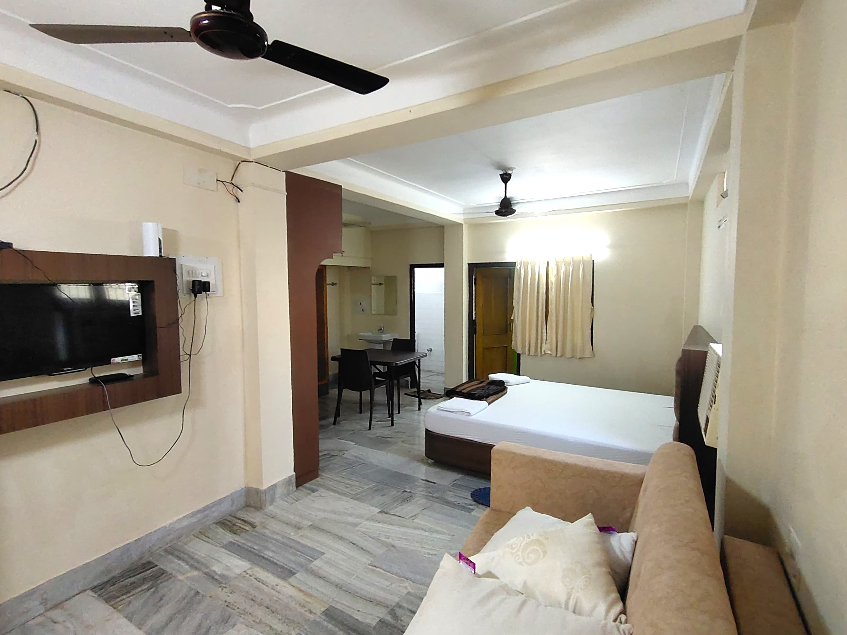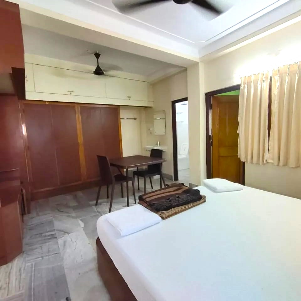 Equipped with AC, TV, Wi-Fi, 24-hour power backup, Hot water, etc., This Massive “Premium 4-bed Family Room” is perfect for a large family or group of friends looking to have a wonderful stay at Jagannath Dham Puri. The Room features a king-size Bed and a modular sofa-cum bed to accommodate maximum 5 people with utmost comfort. Along with that, the room also features a dining table for in-room dining with ease and an independent changing room for convenience.